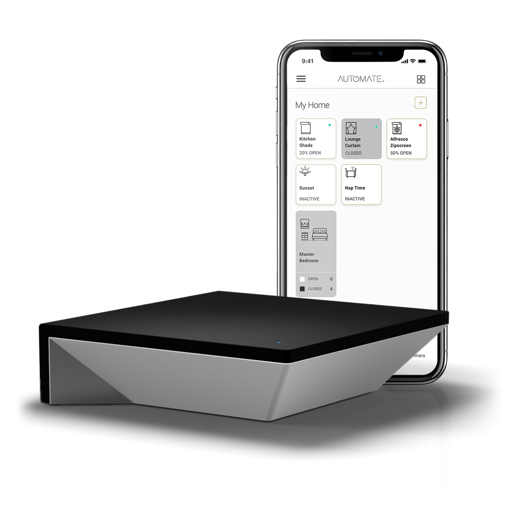 Control every shade from your smartphone or tablet using the Automate Shades App: group by room, create scenes, schedule timers, set routines based on time of day or sun position.
